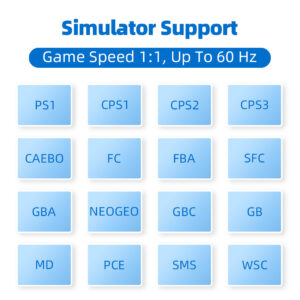 - Hệ game hỗ trợ: PS1/NES/SNES/GB/GBC/GBA/SMD/SMS/PCE/NEOGEO