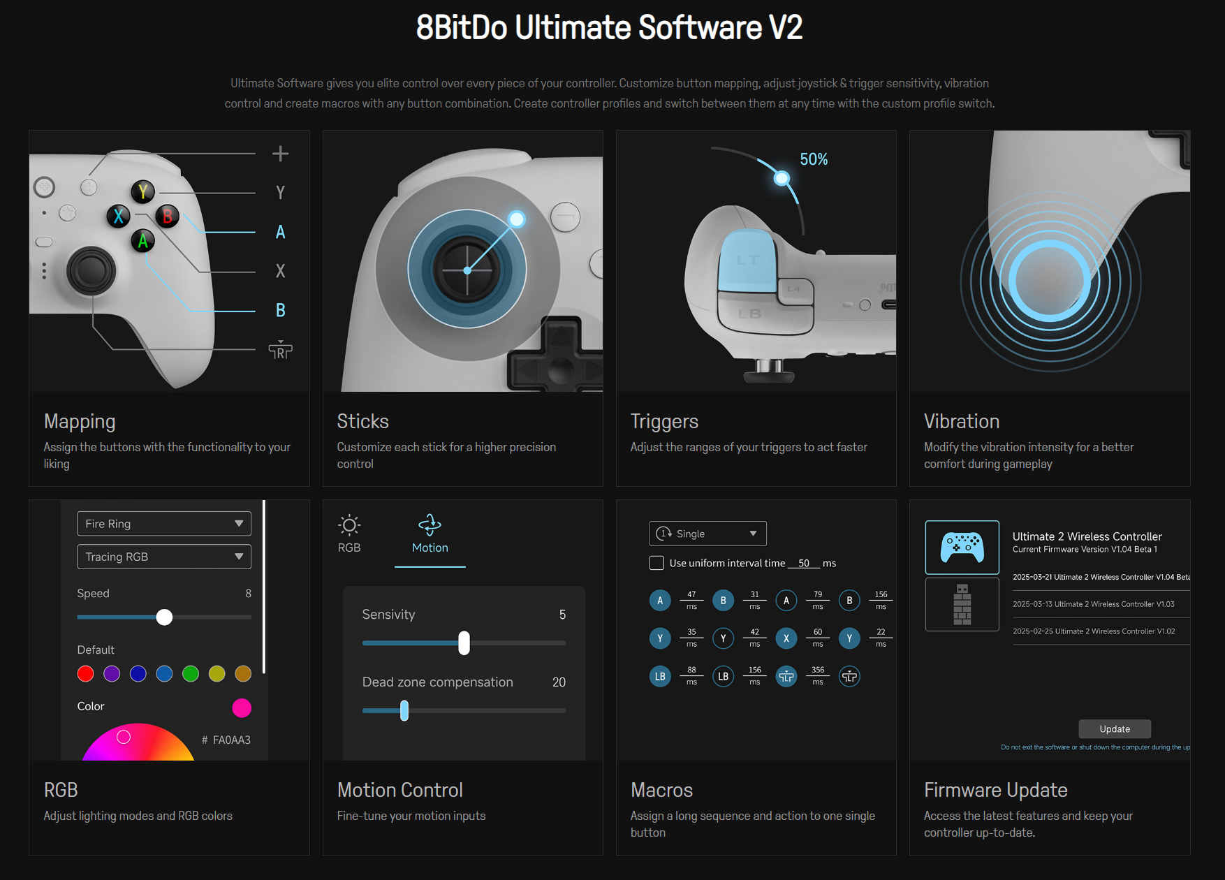 – Cài đặt chi tiết từng tính năng qua phần mềm 8BitDo Ultimate Software V2